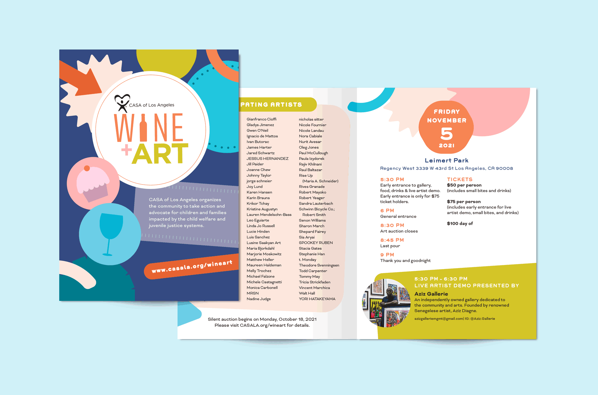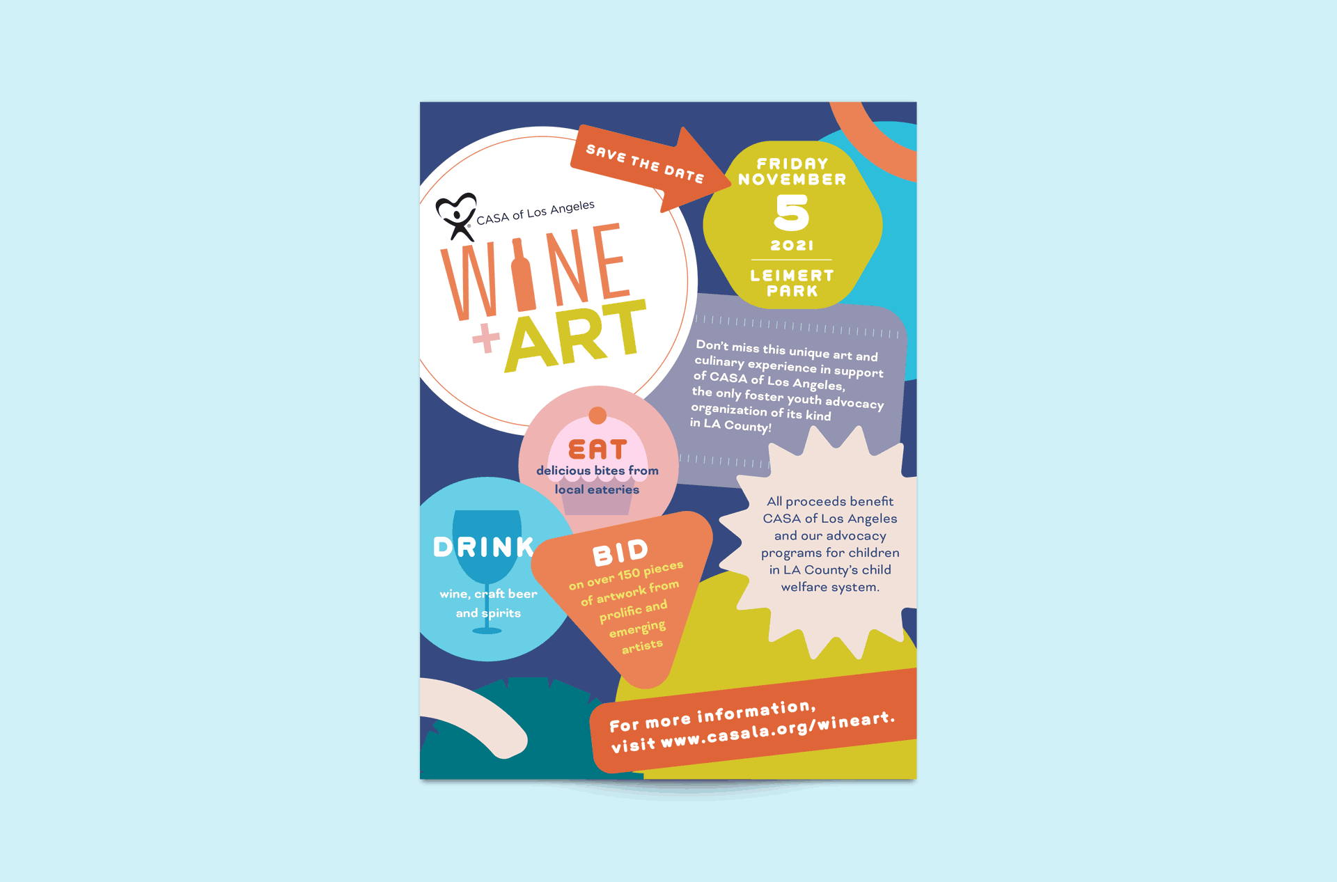 This event invitation package for CASA speaks to the idea of community. Different shapes and graphics are reminiscent of stickers of different shapes and sizes slapped on a wall, symbolizing places that children convene and make their voices heard.