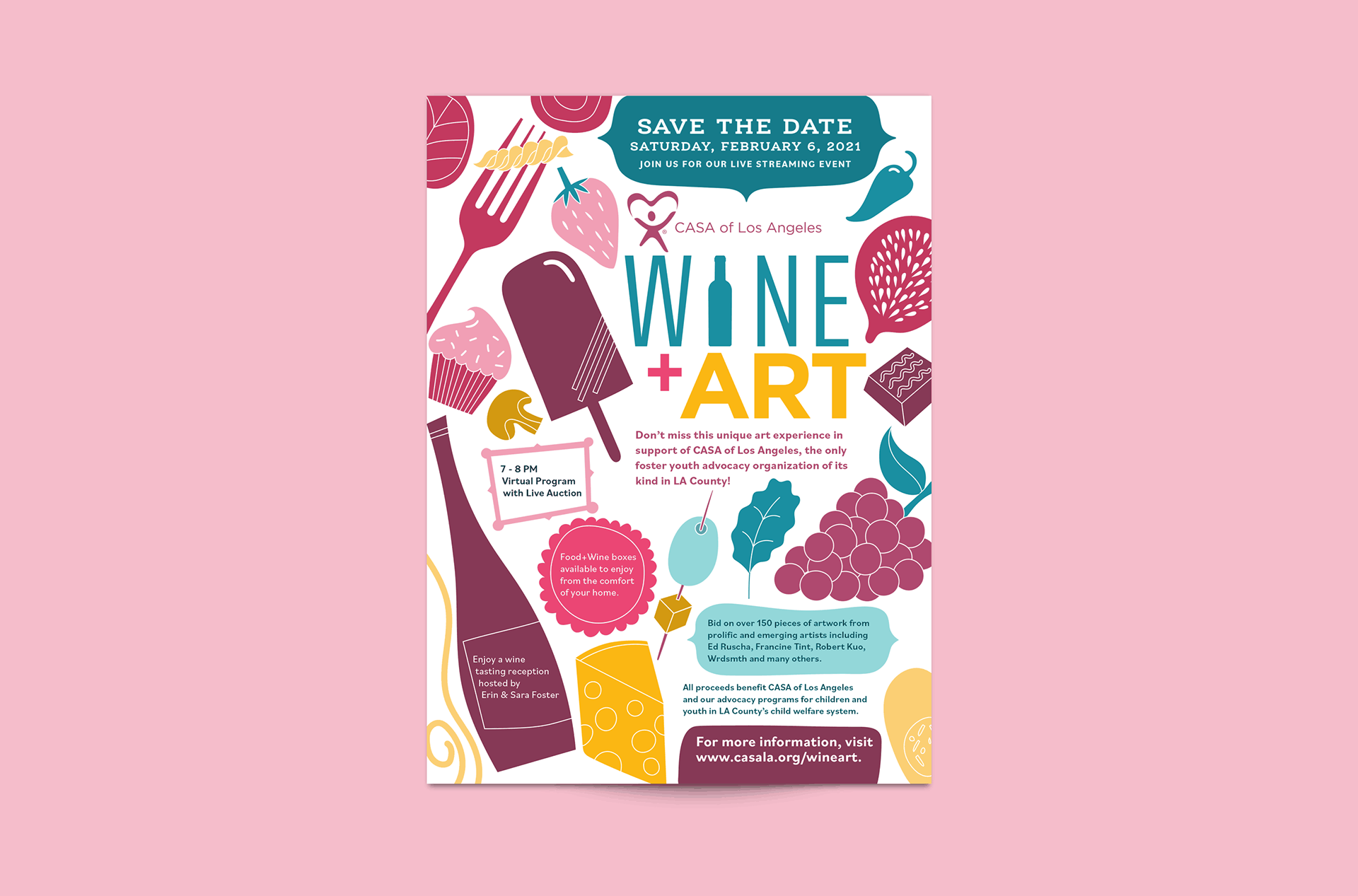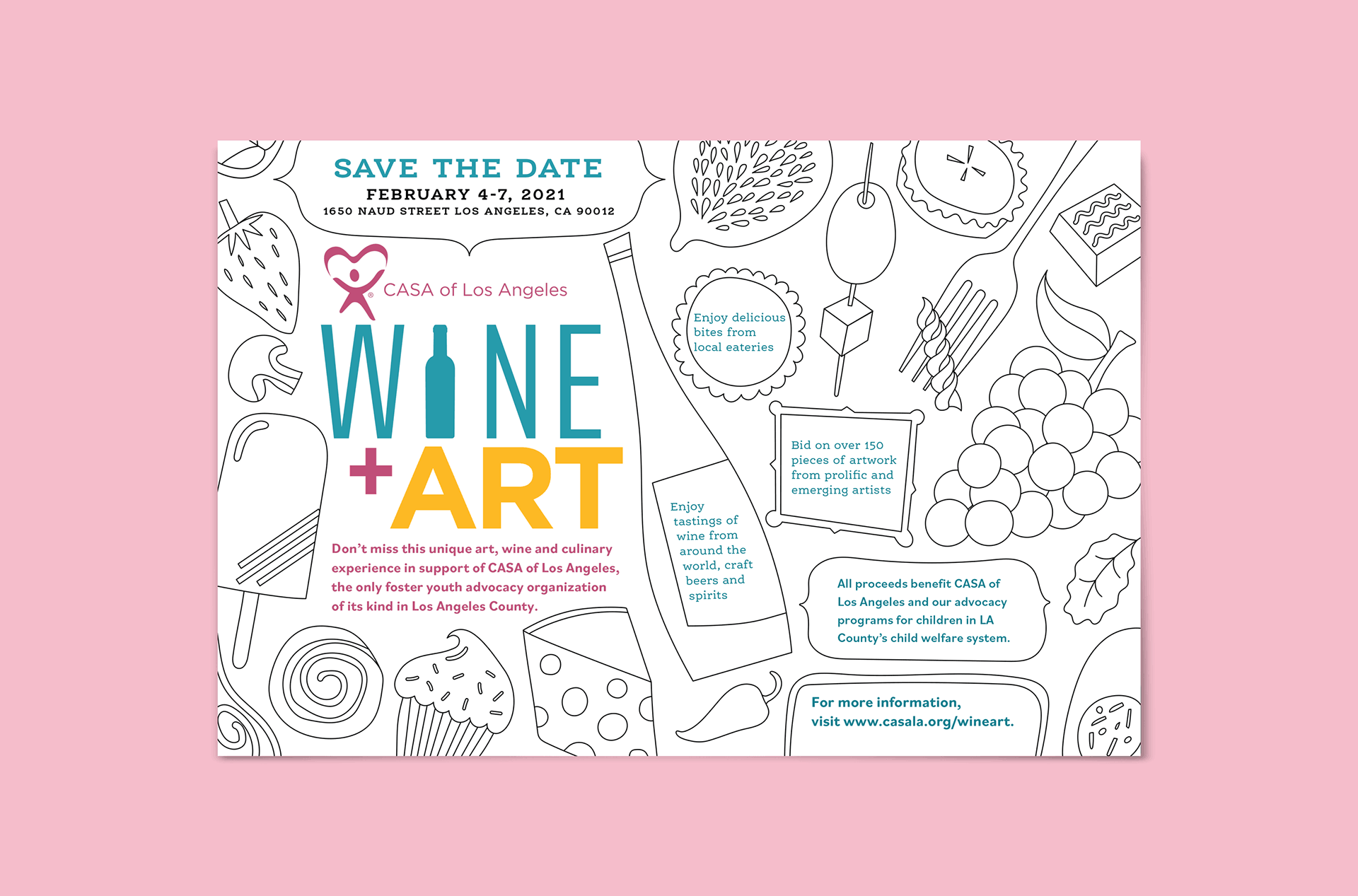 Save The Date announcements for CASA’s annual Wine + Art fundraiser. Coloring cards were planned for invitees to have their own art-making session. As the pandemic dictated a virtual event, the digital invites called for more color!