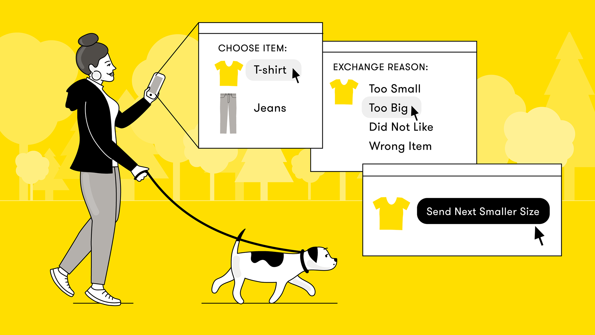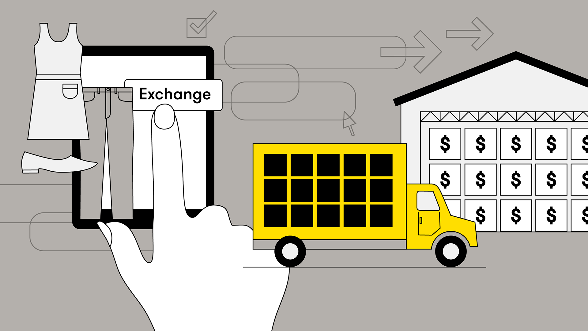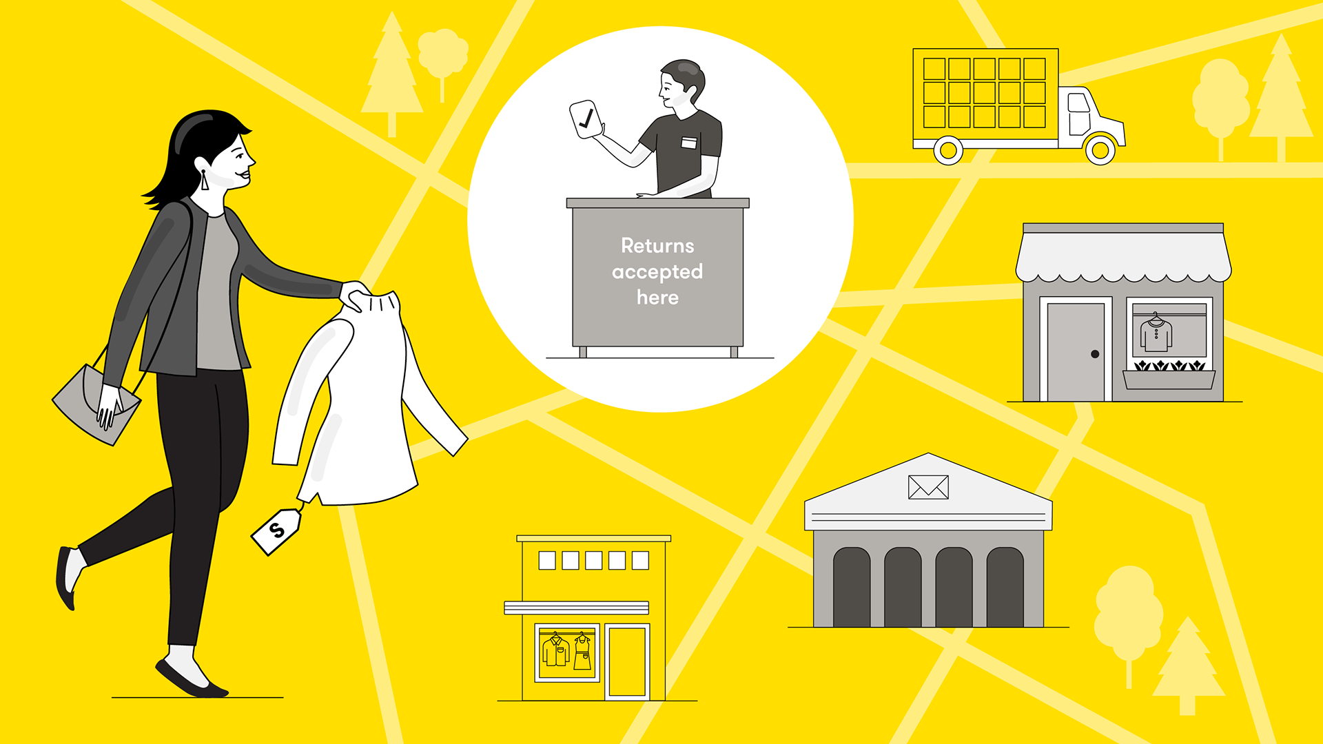 llustrations for a tech startup’s blog. Using the brand’s color palette of black, yellow and gray, these illustrations aimed to tell the story of easy returns and exchanges using return locations and logistics software.