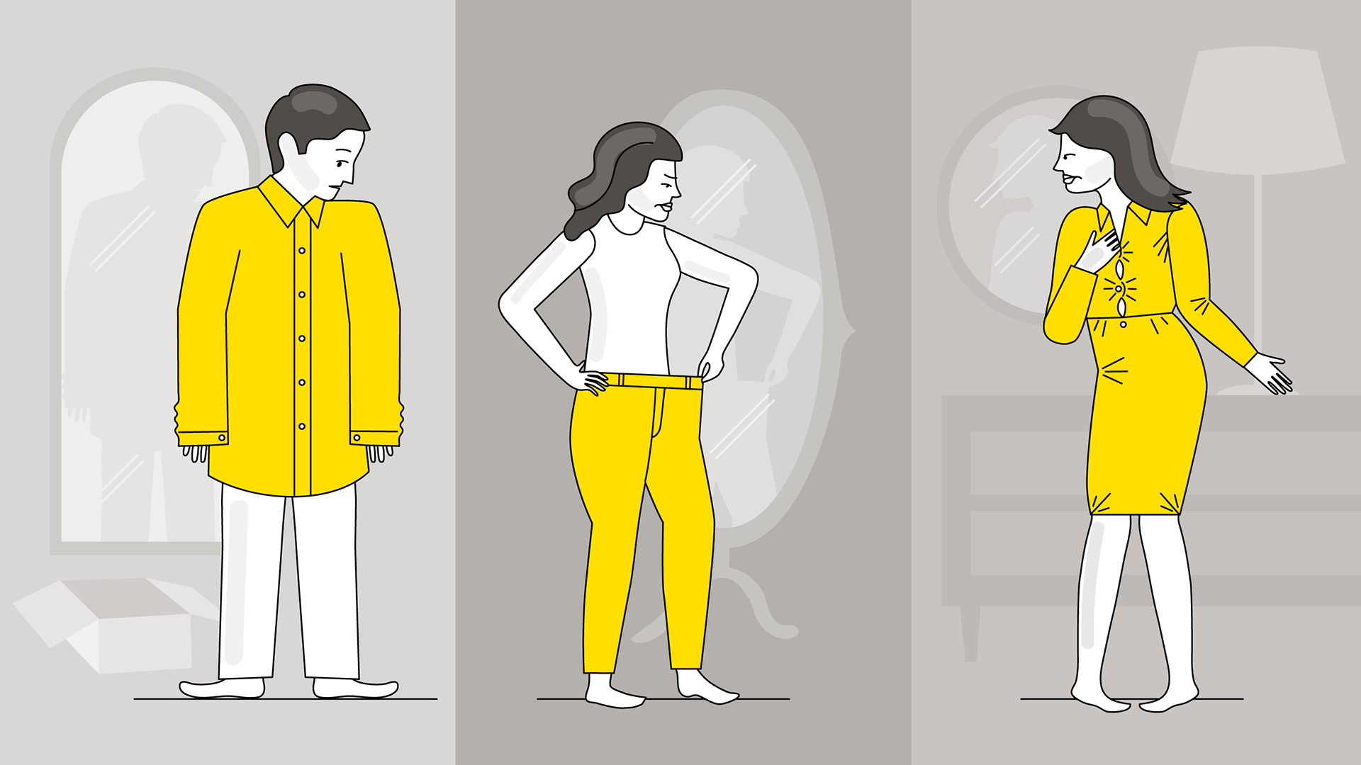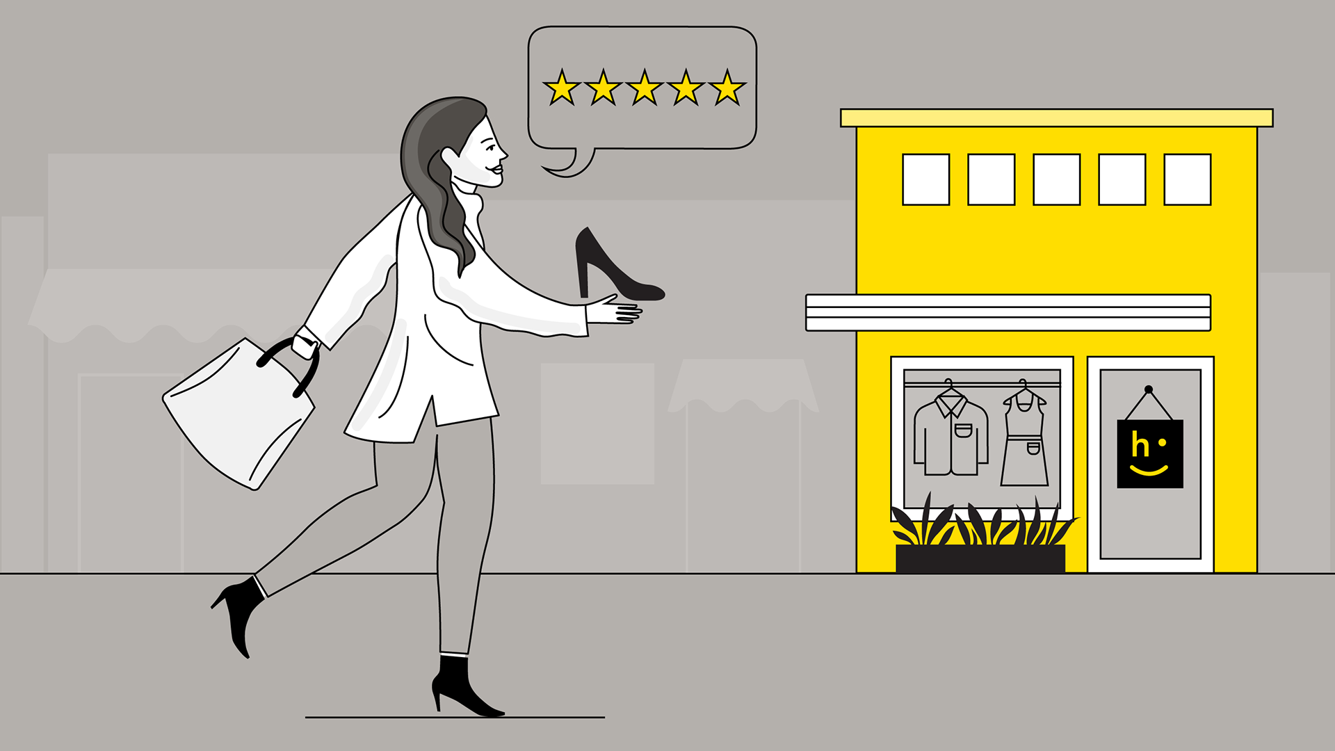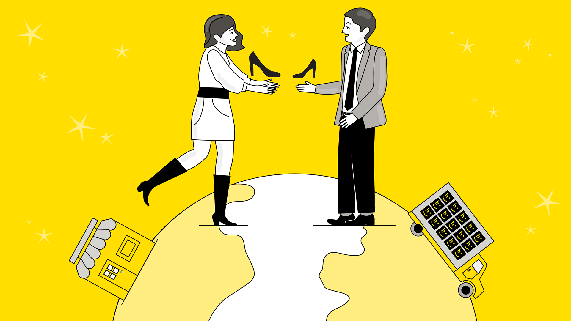 llustrations for a tech startup’s blog. Using the brand’s color palette of black, yellow and gray, these illustrations aimed to tell the story of easy returns and exchanges using return locations and logistics software.