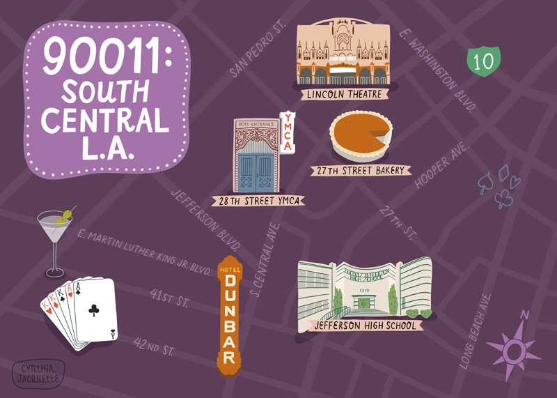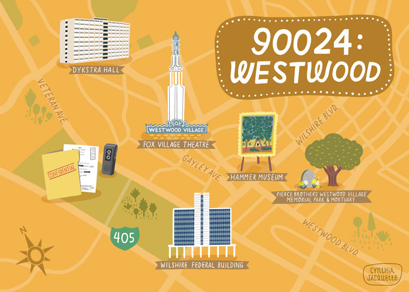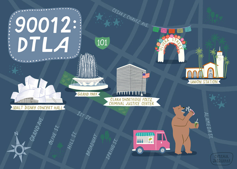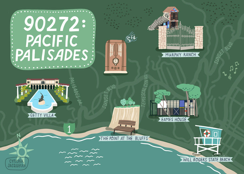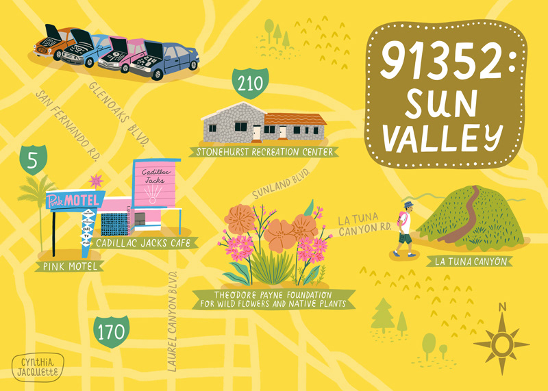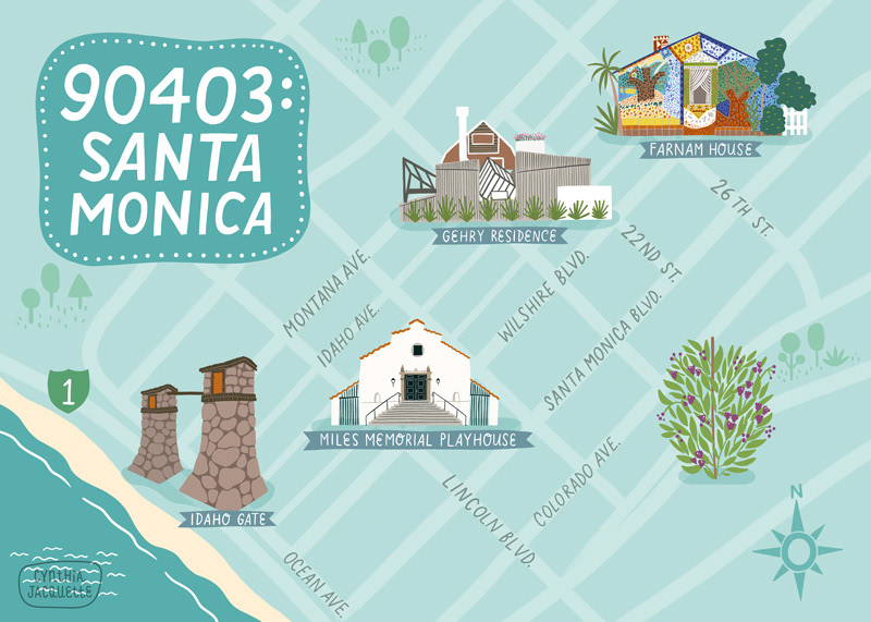 A set of 6 postcards for Antaeus Theatre promoting their "Zip Codes Plays" podcast series. Each play took place in a particular zip code in Los Angeles. Listeners could use these postcard maps to visit each location in real life.